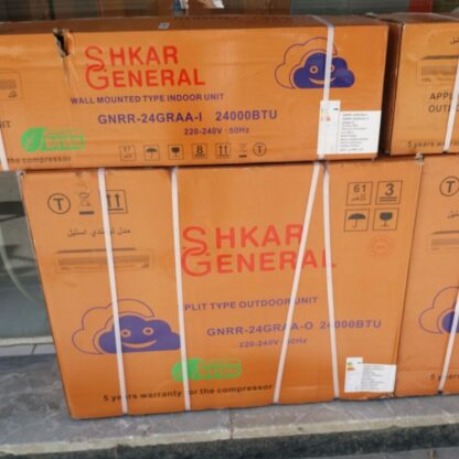 کولر گازی جنرال شکار GNRR-24GRAA مدل لبخندی جزو کولر گازی های 24 هزار جنرال شکاربه حساب می اید. اسپلیت جنرال شکار لبخند مدل 24000 یکی از بهترین و با کیفیتترین محصولات در نوع خود است که توسط این برند معروف تولید شده است. با توجه به کمپرسور تایلندی به کار رفته شده در این کولر بازدهی بالایی داشته و قادر است هوا بسیار خنکی تولید کند. همچنین این موتور قوی با کارایی خوبی که دارد با مصرف انرژی بسیار کمی همراه است و عملکرد فوق العاده از خود نشان میدهد شایان ذکر است که این کولر گازی در حال حاظر در چین منتاژ میشود. این محصول دارای یونیت یا پنل داخلی مدل GNRR-24GRAA-I و یونیت یا پنل خارجی مدل GNRR-24GRAA-O می باشد. این سیستم تهویه مطبوع دیواری جنرال شکار ظرفیت 24000 بی تی یو دارد که برابر با 2 تن (Ton) است. این مدل با توجه به ظرفیتی که دارد برای خرید و استفاده در محیط های متوسط و نسبتا بزرگ حدودا 85 متر گزینه خوبی می باشد. یکی از ویژگیهای مهم در زمان خرید ظاهر و شکل پنل کولر گازی است. کولر گازی جنرال شکار لبخند از نوع اسپلیت است که با طراحی لبخند تولید شده است. لوگو general نیز بر روی پنل داخلی تعبیه شده که نشان دهنده اصالت کالا است همچنین یک نمایشگر LCD که دمای کولر را نشان میدهد نیز وجود دارد هنگامی که کولر را روشن میکنید این نمایشگر نورهای سبز و آبی را نشان میدهد و حتی در تاریکی به راحتی میتوانید دما کولر را ببینید.
